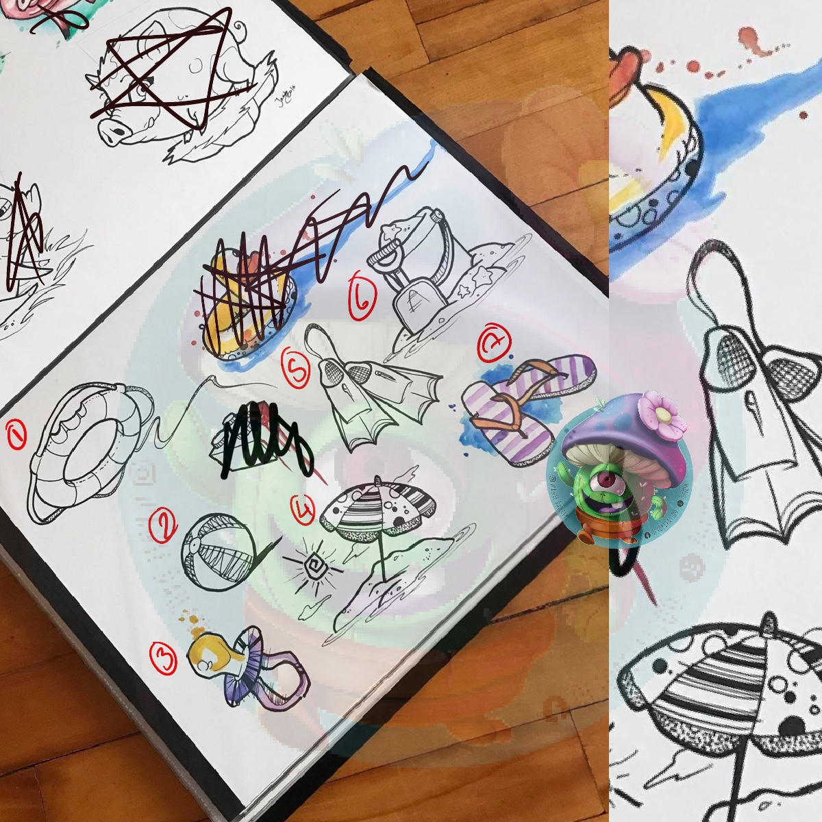 Emplacements proposés :Mot(s) clé(s) : Plage aquarelle watercolor suce ballon sandales sable pelle bouée parasol été