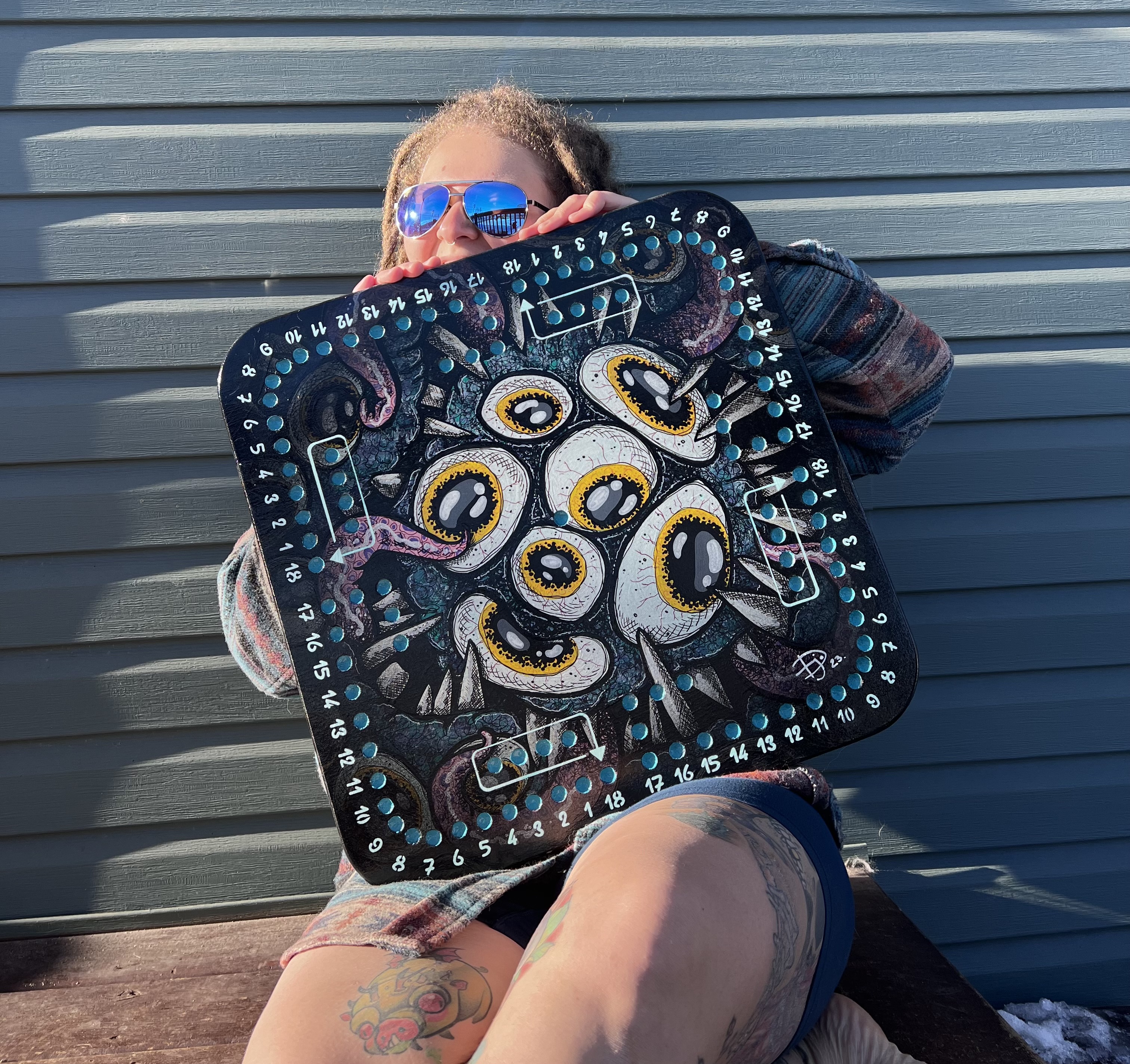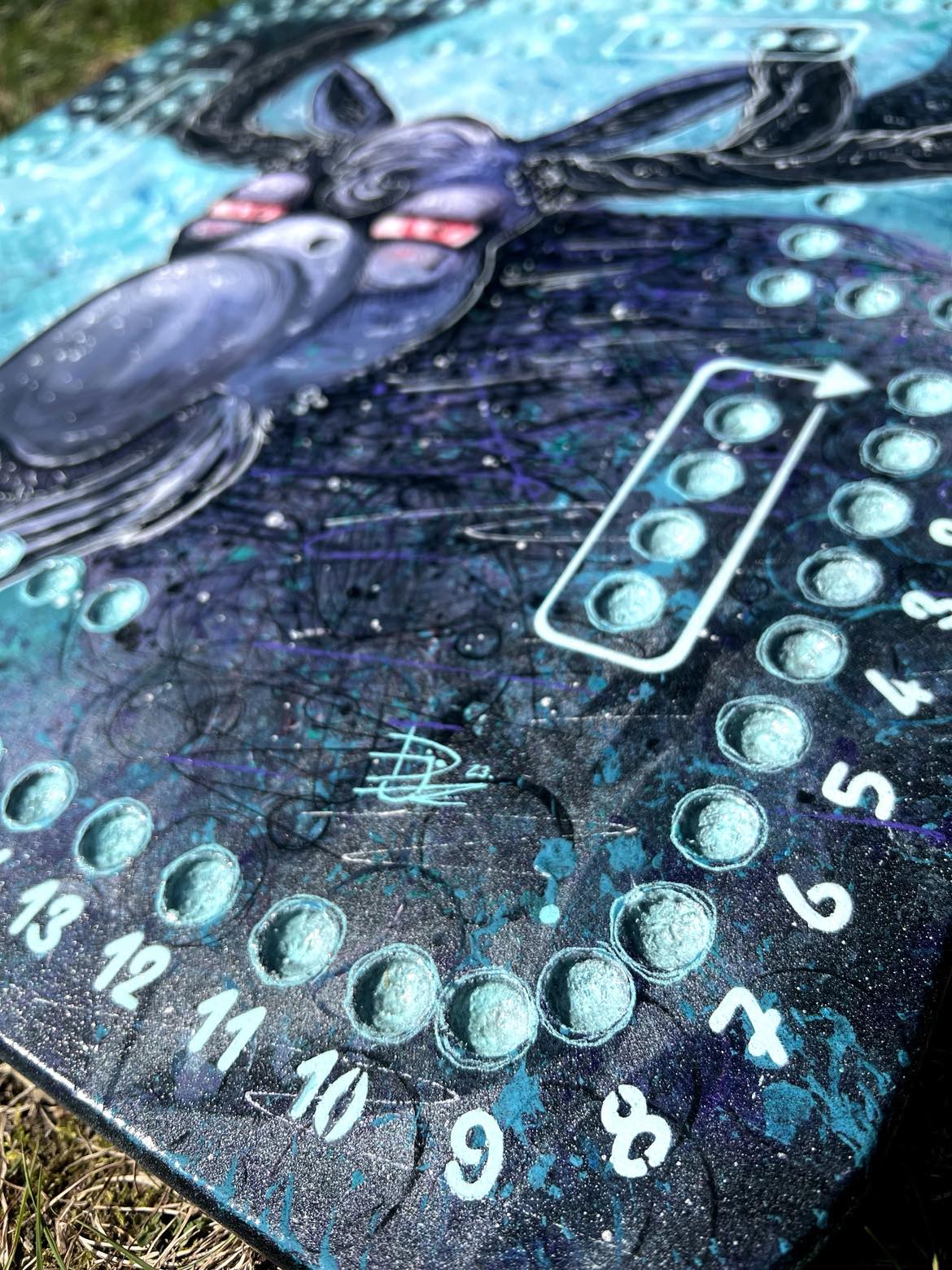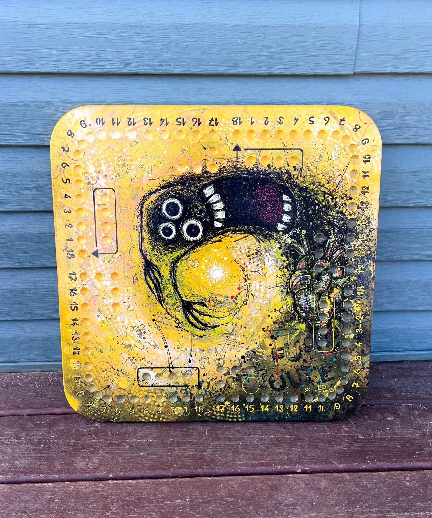J'ai repensé la disposition des trous d'une planche de Tock de façon à pouvoir faire un oeuvre avec la planche qui s'accroche au mur comme déco mais qui est utilisable aussi pour jouer 🤯🤩. Elle sont faite entièrement par mes petits doigts avec amour et tendresse 🥰. Voir les détails en bas de la photo !